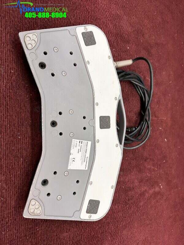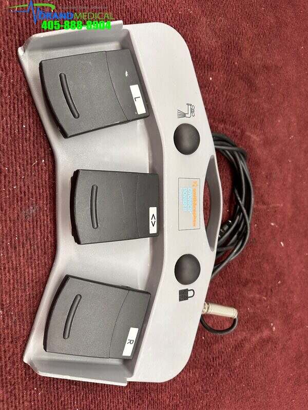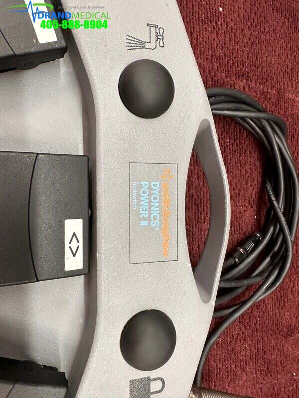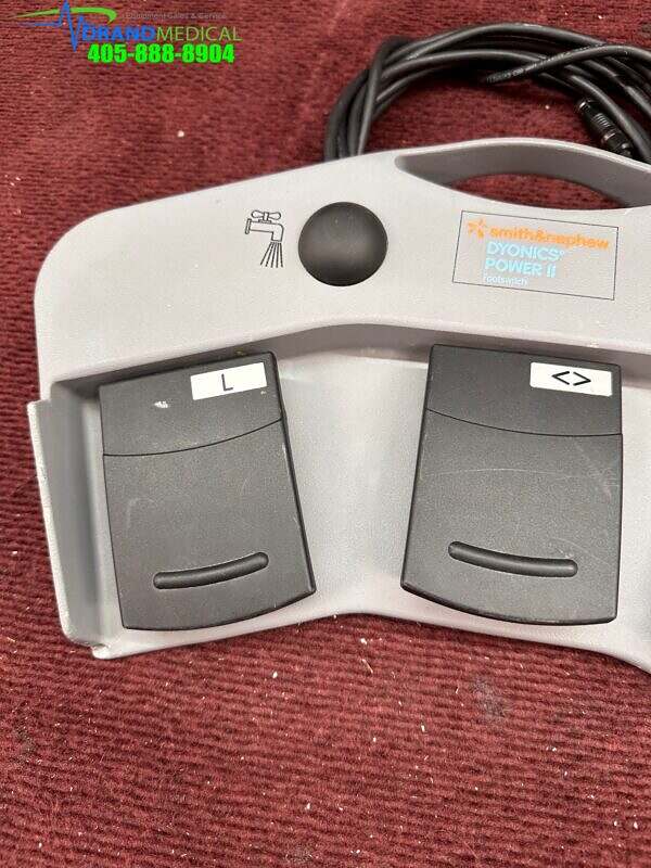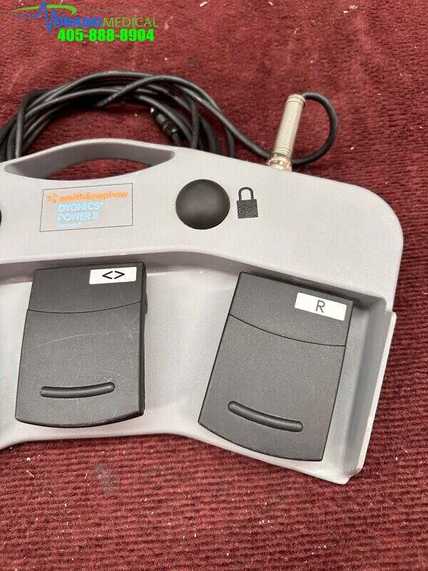 The Smith & Nephew DYONICS POWER II Footswitch(REF 72201092) is a wired footswitch designed for use with the DYONICS POWER II Control Unit(REF 72200873) to control blade action. The footswitch communicates switch and pedal action to the control unit. The footswitch has three control pedals and two switches. The pedals control the forward, reverse, and oscillate modes. The buttons control the Lavage mode and Blade Window Lock Functions. The footswitch can be operated in one of two modes: On/Off or Variable. On/Off will set the footswitch pedals to switch operation. Variable will set the footswitch pedals to adjust the handpiece speed based on pedal pressure.